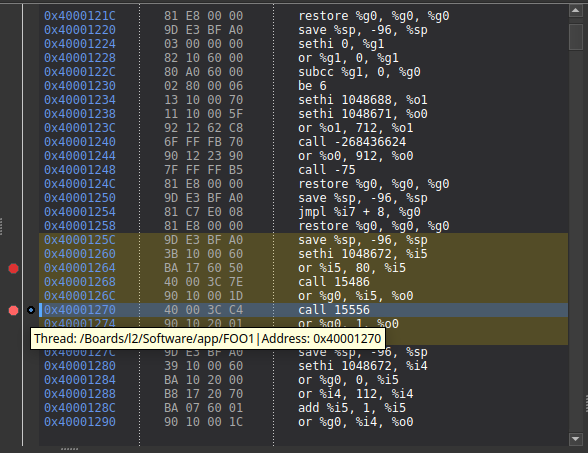 The disassembly view integrates with the breakpoint system:
